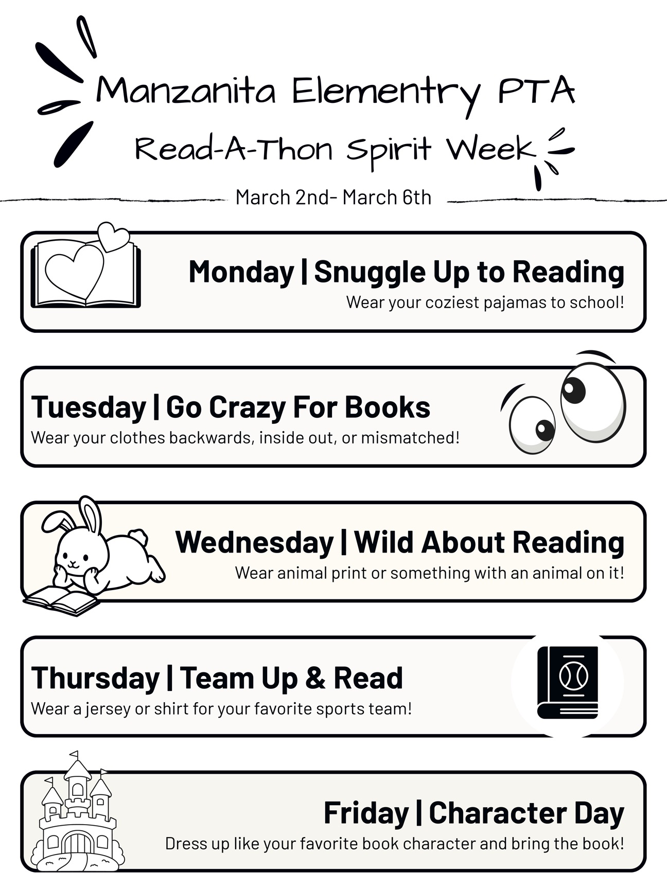 We are beyond excited to kick off our Read-a-thon fundraiser and celebration of reading! On Monday, March 2nd, we will begin with a Read-In—a special day dedicated to cozy reading, literacy activities, and celebrating the joy of books. Students are welcome to wear pajamas, bring a stuffed "reading pal," and enjoy dedicated time to read and engage with fun literacy experiences throughout the day. We will also be launching Spirit Week to build excitement as we embark on the next two weeks of reading fun and fundraising!